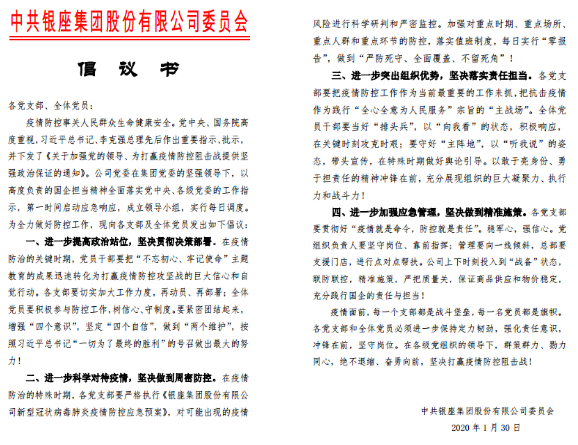 1月30日下午,銀座集團黨委發出倡議,在疫情防治的特殊時期,號召基層黨支部發揮戰斗堡壘作用,時刻保持“戰備”狀態;號召黨組織負責人勇做“領頭雁”,堅守崗位、靠前指揮;號召全體黨員爭做“排頭兵”,增強定力韌勁、沖鋒在一線;號召總部黨支部支援門店,進行點對點幫扶。