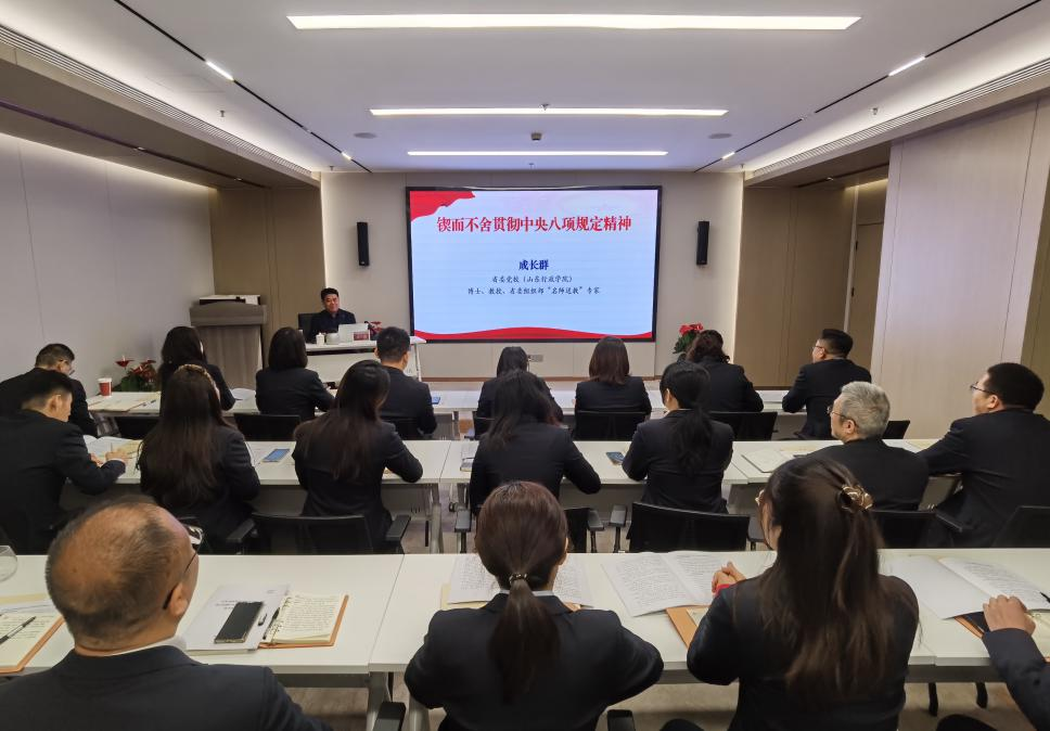 讀書班期間,全員通過集中學習、個人自學和分組交流研討等方式,認真學習了習近平總書記關于加強黨的作風建設的重要論述和中央八項規定及其實施細則精神,中共山東省委黨校(山東行政學院)成長群教授作《鍥而不舍貫徹中央八項規定精神》專題授課。