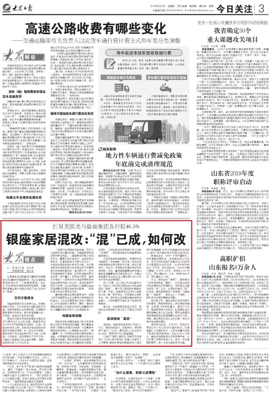 (大眾日?qǐng)?bào) 記者/付玉婷)紅星美凱龍日前宣布以增資和收購(gòu)股權(quán)方式戰(zhàn)略投資銀座家居,與山東省商業(yè)集團(tuán)有限公司(下稱(chēng)魯商集團(tuán))各以46.5%的持股比例獲得共同控制權(quán),全國(guó)家居流通業(yè)唯一的國(guó)企實(shí)現(xiàn)了與行業(yè)標(biāo)桿的“聯(lián)姻”。