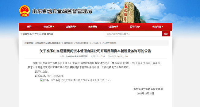 11月20日,山東省地方金融監(jiān)督管理局發(fā)布公告批復(fù),同意山東易通民間資本管理有限公司開展民間資本管理業(yè)務(wù),并依法頒發(fā)了業(yè)務(wù)許可證。至此,易通發(fā)展集團(tuán)金融板塊再添一員生力軍。