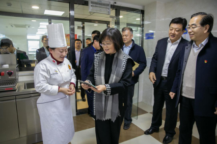 周春艷一行在城市學(xué)院黨委書記宋寧陪同下,現(xiàn)場視察了學(xué)院餐旅產(chǎn)教融合實訓(xùn)基地(誠悅酒店)、中餐實訓(xùn)中心、西餐實訓(xùn)中心等,認(rèn)真聽取了宋寧關(guān)于學(xué)院綜合改革、專業(yè)建設(shè)、新型學(xué)徒制推廣、混合所有制探索等情況的匯報。視察中,周春艷深入課堂,親切慰問了學(xué)院師生,并親自為第44屆世界技能大賽西餐項目優(yōu)勝獎獲得者曲笛頒發(fā)“山東惠才卡”,勉勵她珍惜榮譽、再接再厲,在教師崗位上發(fā)揮自身技能特長,培養(yǎng)出更多高技術(shù)技能人才,為區(qū)域經(jīng)濟發(fā)展作出更大貢獻。