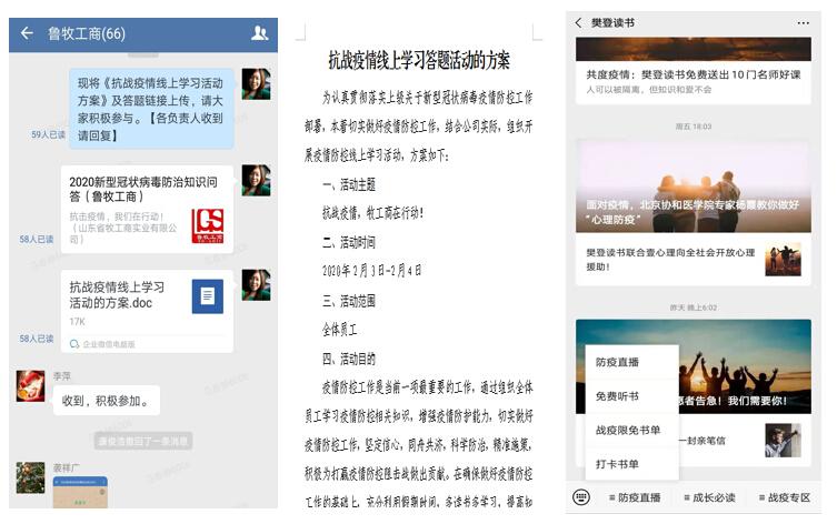 牧工商全體員工通過官方媒體、學(xué)習(xí)強國及集團發(fā)布的疫情相關(guān)信息等自行學(xué)習(xí),積極關(guān)注“樊登讀書”微信公眾號“防疫直播”欄目,了解疫情動態(tài)和疫情防護知識等信息,并采取微信線上“新型冠狀病毒防治知識問答”答題、分享等方式,加強疫情防控知識學(xué)習(xí)。活動中,全體員工積極參與,學(xué)習(xí)答題熱情高漲,在提高自身疫情防護意識的同時,以實際行動正面宣傳,引導(dǎo)周圍群眾,體現(xiàn)國企擔(dān)當(dāng)。在確保做好疫情防控工作的基礎(chǔ)上,提倡大家充分利用假期時間,多讀書多學(xué)習(xí),提高知識水平,提升工作能力。