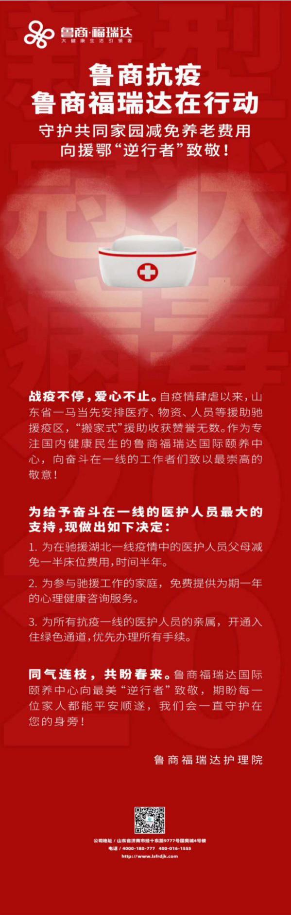 近日,為向馳援湖北一線的醫護人員表達敬意,魯商發展所屬的魯商福瑞達國際頤養中心決定為馳援湖北一線的醫護人員父母減免一半床位費用,時間半年。