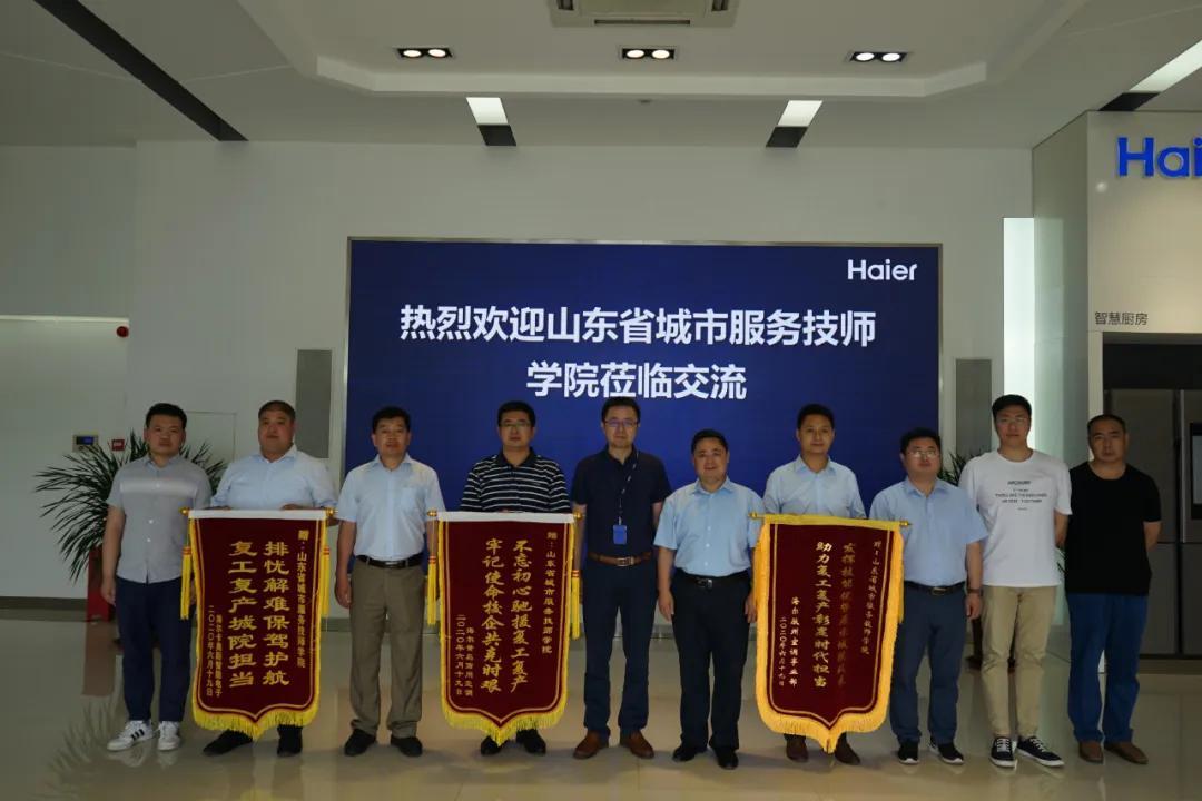 下午,調研組一行來到到海爾集團嶗山廠區,在總經理高廣偉陪同下參觀了生產車間并慰問了部分跟崗實習學生。刁洪斌一行與海爾卡奧斯的領導進行了交流座談。高廣偉代表企業向調研組介紹了學院實習學生的工作、生活情況,對學院師生所展現的優良思想品質與務實工作作風給予高度贊揚。尤其是在疫情防控特殊時期,省城市學院積極馳援,助力復工復產,更彰顯了學院師生履行社會責任、服務經濟社會的拳拳之心,他代表海爾集團對省城市學院深表感謝和敬意。校企雙方圍繞招工招生一體化、共建實習實訓中心、人才培養模式創新、企業教師工作站建設、學院為海爾員工培訓等內容進行了深入的交流和探討,雙方就海爾集團在學院投資建設生產型實訓中心和職業訓練基地達成合作意向。座談結束后,刁洪斌代表學院接收了企業贈送的感謝錦旗。