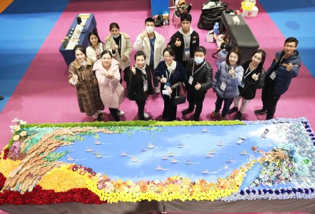 承接布展工作以來,學院領導高度重視,召開專題會議研究布展方案,發揮學院雙高專業群技能技藝優勢,組建“技能技藝主題成果展示”創意設計團隊,配合完成主題展示創作和技能展示。“千帆競發”展臺寓意部省共建職業教育創新發展高地工作蓄勢起航,象征學院推進“雙高計劃”建設、實現高質量發展風帆正舉。學院山東省中華優秀傳統文化傳承基地非物質文化遺產餑餑榼子構成“大樹”“游魚”的視覺形象,“大樹”象征“立德樹人、教書育人”的教育理念;“游魚”意味著莘莘學子力爭上游的精神;用衍紙花、面花和藝術插花代表學院各專業融合之美,寓意“百花齊放,專業融合”;“浪花”與“帆船”寓意乘風破浪、勇往直前的精神;孔雀是才華和品德的象征,體現了學院德育為先、知行合一的育人理念。