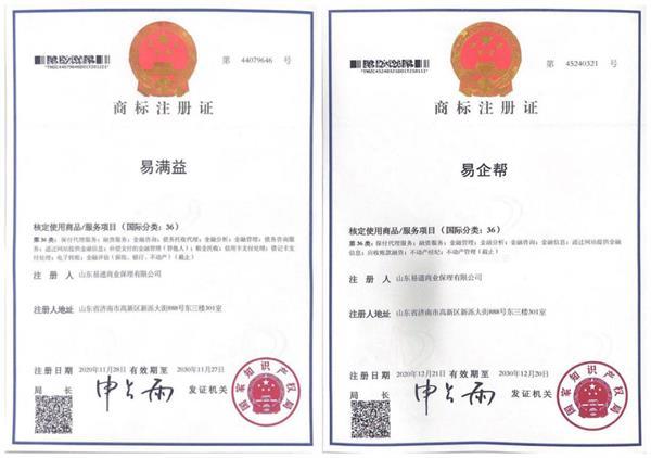近日,國家知識產權局商標局網站發(fā)布公告,易通保理申請注冊的“易滿益”“易企幫”公告期滿,獲得由國家知識產權局頒發(fā)的國家商標注冊證書。