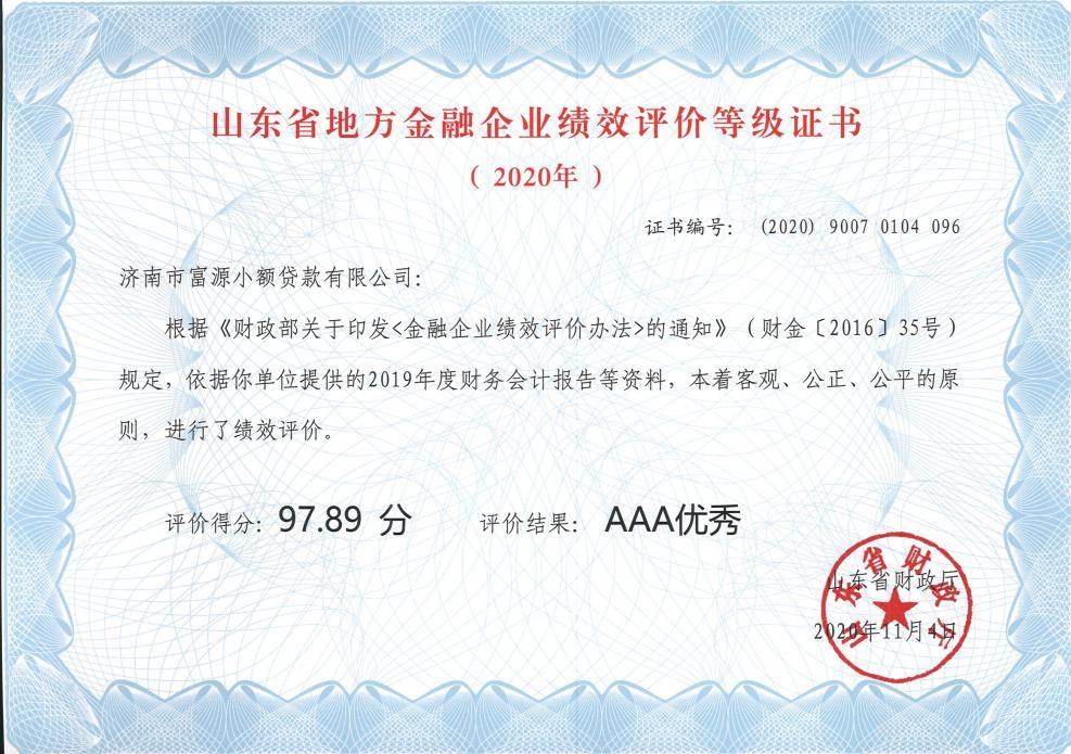 近日,富源小貸收到省財政廳頒發(fā)的2020年山東省金融企業(yè)績效評價“AAA優(yōu)秀”等級證書。根據(jù)評價結(jié)果,公司績效狀況在全國其他類金融企業(yè)中處于優(yōu)秀水平。前期公司已獲評省地方金融監(jiān)管局全省小貸公司分類評級Ⅰ級,至此公司連續(xù)兩年成為全省“雙優(yōu)”小貸公司。