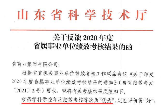 本次績效考核結果,是對省藥科院2020年度工作的認可,省藥科院將再接再厲,突出“黨建引領+科研創新”管理模式,穩步推進各項工作,開拓創新,砥礪奮進,奮力譜寫新時代發展新篇章,為打造全面創新的新魯商和建設新時代現代化強省貢獻藥科院力量,以優異成績慶祝中國共產黨成立100周年。