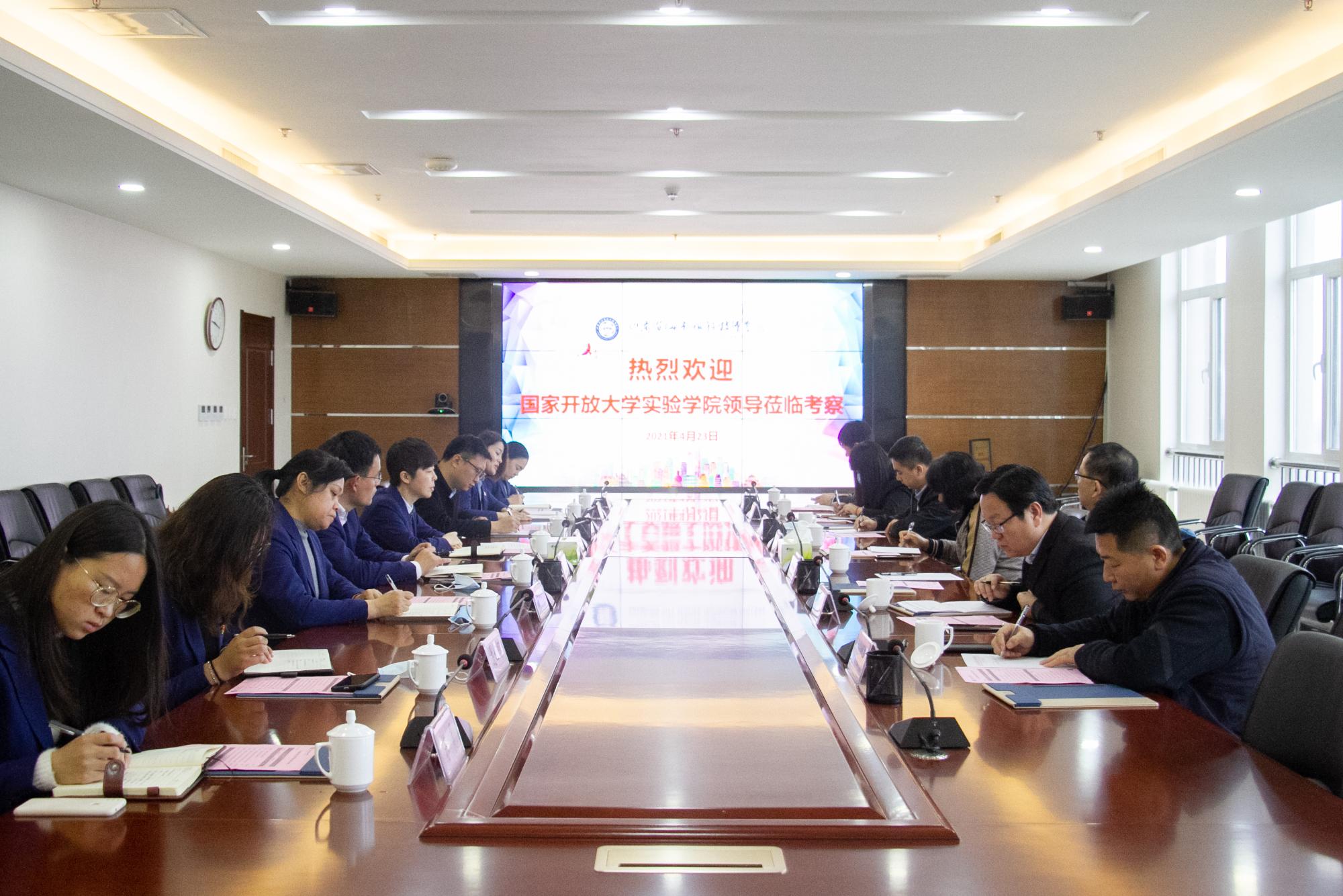 4月23日,國家開放大學實驗學院院長郭青春、實驗學院現代應用技術學院院長平桂祥帶領相關業務負責人蒞臨省城市學院調研走訪。省城市學院副院長賀鴻接待并出席座談會。