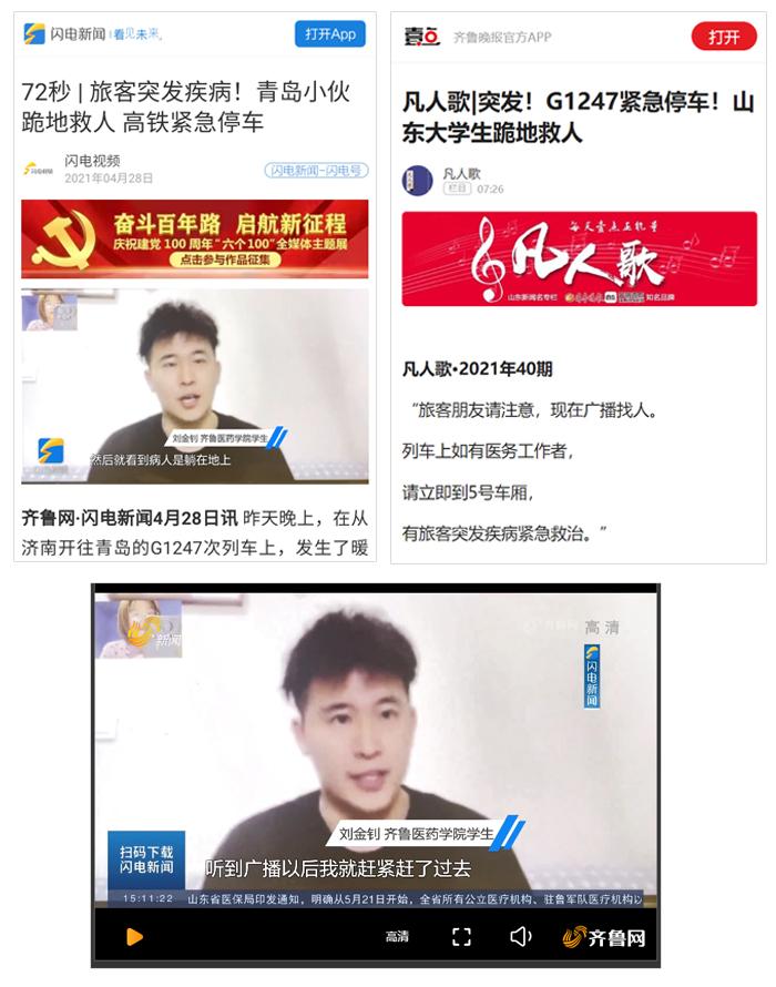4月27日20:01分,在濟南站開往青島北站的G1247次列車上,一旅客突發(fā)暈厥、渾身抽搐。緊急時刻,齊魯醫(yī)藥學院學生劉金釗挺身而出、果斷出手,與列車員、熱心旅客一同展開施救。“當時第一反應不是害怕,而是想幫著旅客渡過危險期,把我在學校學到的專業(yè)知識和急救技能全部用上,盡最大的努力為病人減輕痛苦,爭取延續(xù)生命的機會?!?談到此次救人行為,劉金釗這樣說。他的事跡,先后被山東電視臺新聞頻道、齊魯晚報、齊魯壹點、海報新聞等10多家媒體關注報道。
