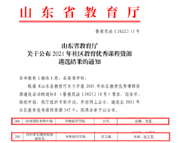 近日,省教育廳公布2021年社區教育優秀課程資源遴選結果,齊魯醫藥學院《如何預防食物中毒》《內科常見慢性病健康指導》2門課程被評為優秀課程資源。省教育廳擬將其推介到國家終身教育智慧教育平臺。