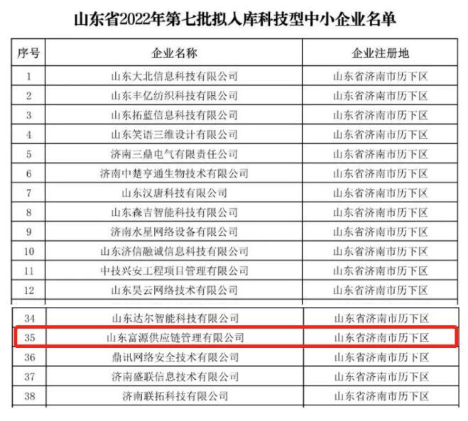 近日,省科技廳公布2022年第七批擬入庫科技型中小企業(yè)名單,魯商資本旗下山東富源供應鏈管理有限公司(以下簡稱“富源供應鏈”)成功入選。