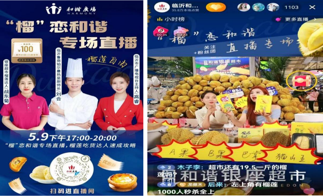 4月29日至5月3日,臨沂和諧店超市煥新開業(yè)之際,借助公司統(tǒng)一訂購泰國金枕榴蓮的價格優(yōu)勢,門店進(jìn)行大堆頭陳列,提前兩天在抖音進(jìn)行預(yù)售團(tuán)購,銷售團(tuán)券近80萬元。
