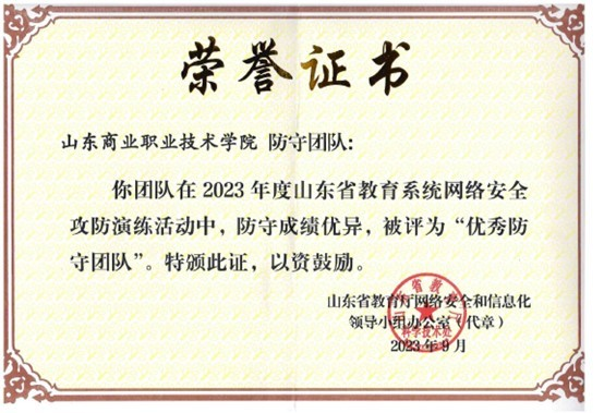 9月12日,2023年國家網絡安全宣傳周山東省校園日活動啟動儀式上對2023年度山東省教育系統網絡安全攻防演練表現突出的攻擊隊伍和優秀防守單位進行現場表彰,山東商職學院獲評“優秀防守團隊”。