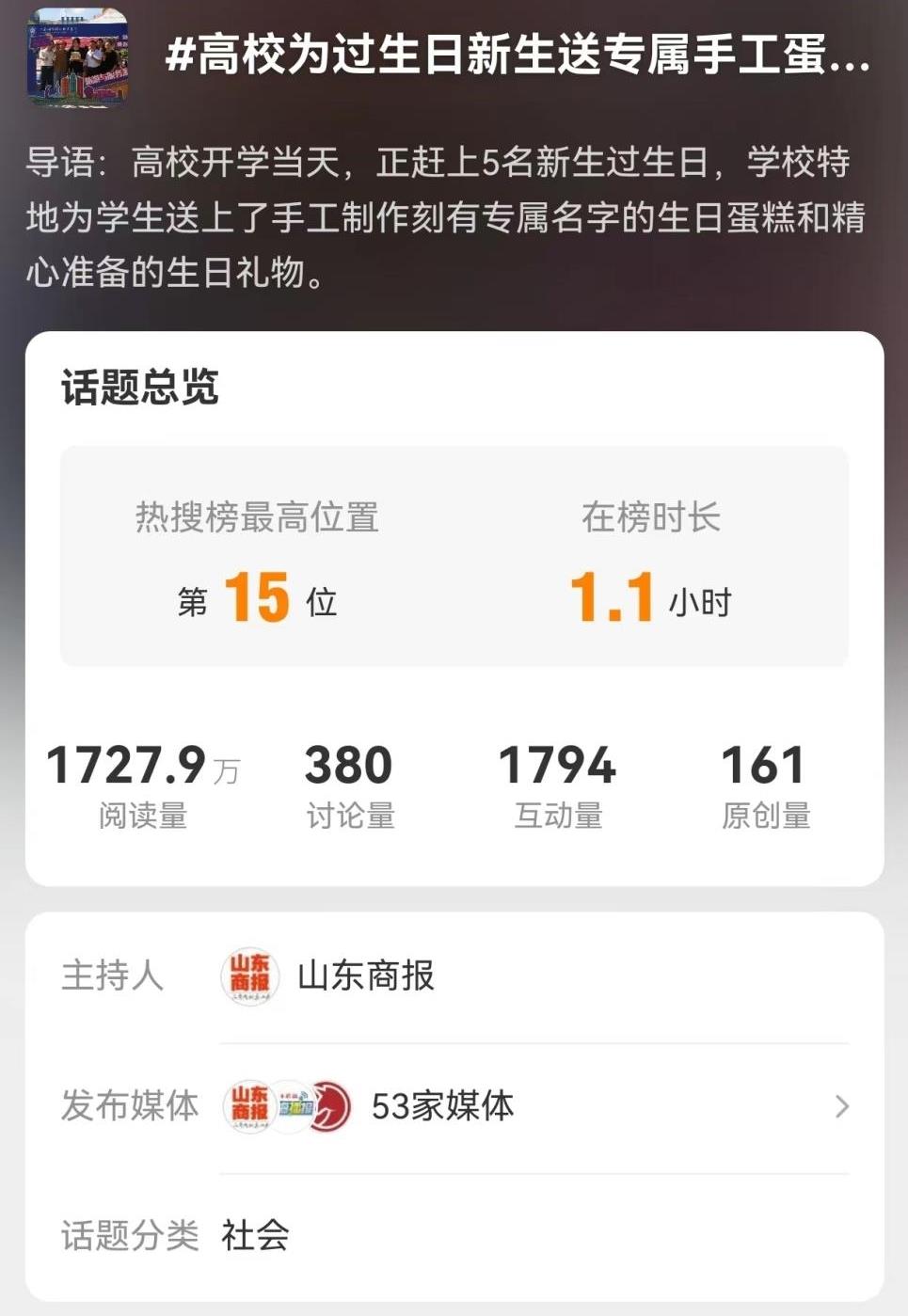 學校還為9月9日集中報到日當天過生日的學生送上了生日蛋糕,蛋糕由西餐學院的老師親手制作,并刻有過生日學生的名字,相關視頻經媒體報道后迅速登上煙臺同城熱搜第1位,全國熱搜第15位,瀏覽量超2000萬。