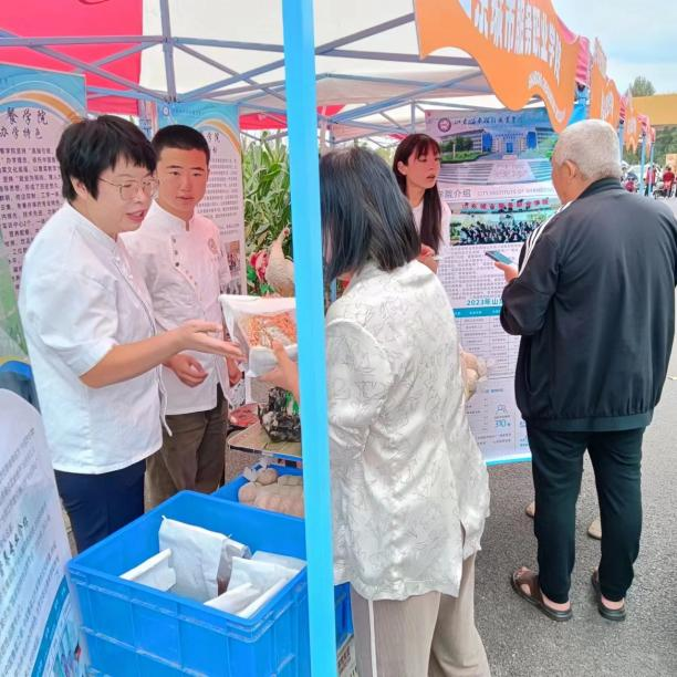 在高新區新添堡豐收節現場,山東城市學院展示了20余種自主研發的食品新品種,包括大棗糕、喜餅、月餅和糖酥杠子頭等,吸引眾人前來觀摩、品嘗和咨詢。學校中餐學院副院長李榮與志愿者耐心解答,并提供惠農科技服務。