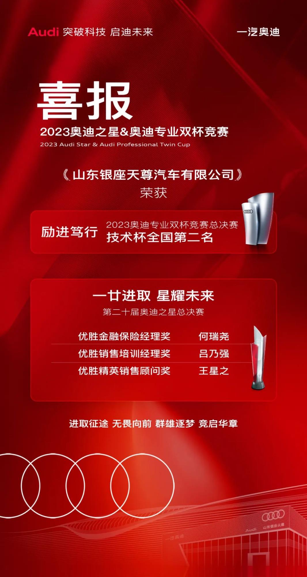 從心出發(fā),卓·悅無盡。奧迪雙杯競賽是展示經(jīng)銷商售后服務(wù)綜合實(shí)力的競技、交流和分享平臺(tái)。銀座天尊售后團(tuán)隊(duì)?wèi){借專業(yè)的技術(shù)知識(shí)和強(qiáng)勁的實(shí)操能力斬獲“2023年奧迪專業(yè)雙杯競賽-技術(shù)杯第二名”的殊榮。
