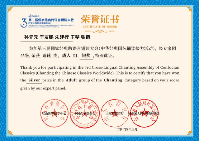 近日,第三屆儒家經(jīng)典跨語言誦讀大會(中華經(jīng)典國際誦讀接力活動)落下帷幕。青島酒店管理職院教師孫元元、于友鵬、朱建樺、王斐、張萌合作的中英雙語誦讀作品《季氏將伐顓臾》從12400余件作品中脫穎而出,摘得誦讀類成人組銀獎及“網(wǎng)絡人氣作品”,5位教師獲評“儒家經(jīng)典傳誦人”。
