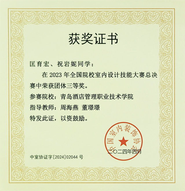 近日,2023年全國院校室內設計技能大賽總決賽舉行,青島酒店管理職院參賽隊伍榮獲團體三等獎,周海燕、董璟璟老師榮獲優(yōu)秀指導教師。