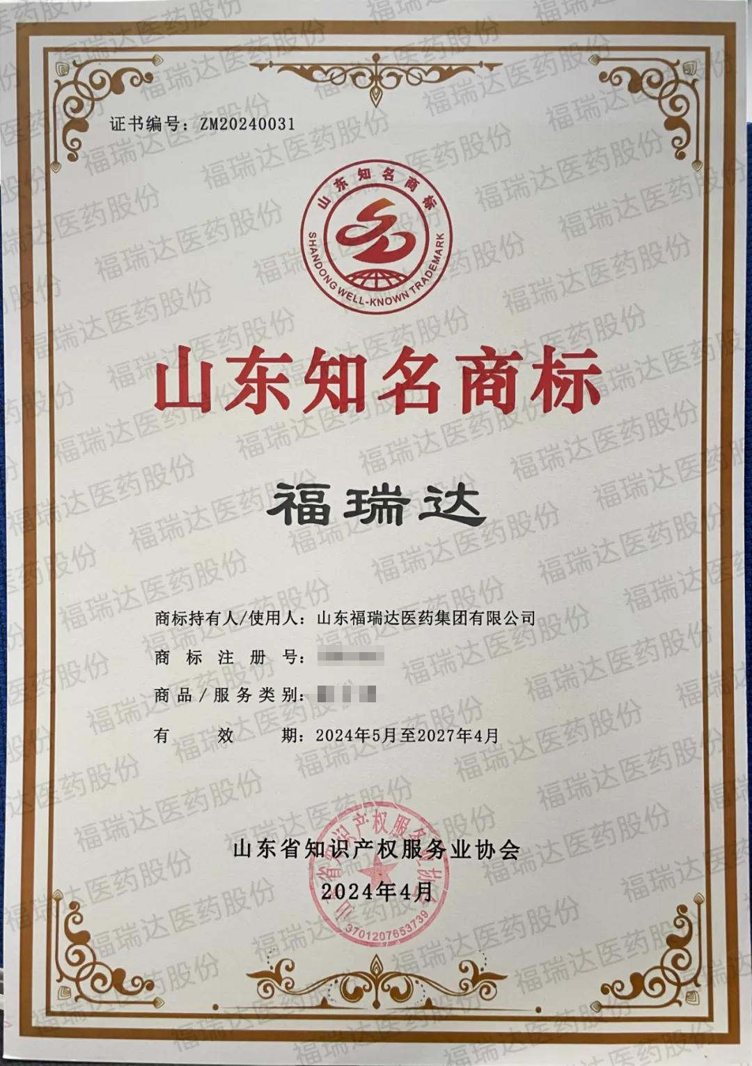 近日,山東知名商標授牌儀式在“4.26世界知識產權日”主題活動暨軍創市場主體知識產權轉化運用大會上舉行,“福瑞達”被認定為“山東知名商標”。