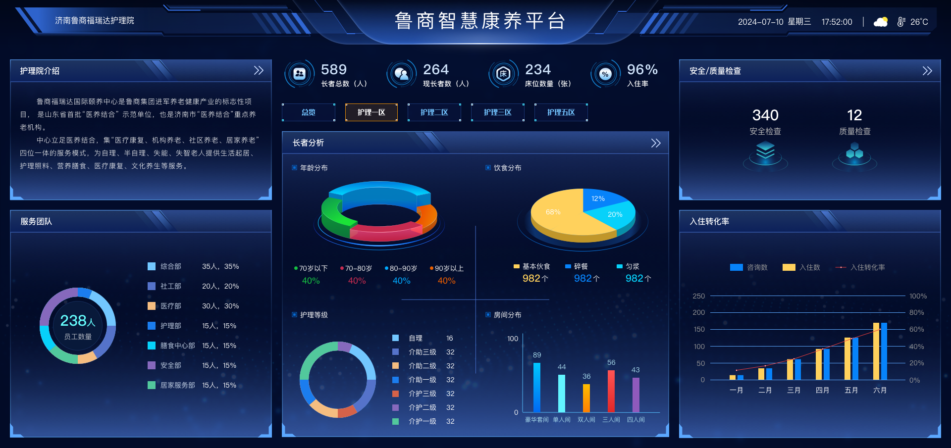 “魯商智慧康養(yǎng)院務(wù)管理平臺(tái)”由魯商產(chǎn)投所屬魯商福瑞達(dá)健康公司聯(lián)合魯商科技共同打造,是基于養(yǎng)老服務(wù)領(lǐng)域數(shù)字化轉(zhuǎn)型需求,以濟(jì)南魯商福瑞達(dá)護(hù)理院咨詢、入住、護(hù)理、醫(yī)療、評(píng)估、膳食等養(yǎng)老服務(wù)場(chǎng)景為藍(lán)本,研發(fā)的一款數(shù)字化智慧康養(yǎng)服務(wù)平臺(tái)。通過推動(dòng)云計(jì)算、大數(shù)據(jù)、物聯(lián)網(wǎng)等數(shù)字化技術(shù)在養(yǎng)老服務(wù)領(lǐng)域的融合創(chuàng)新和多場(chǎng)景應(yīng)用,實(shí)現(xiàn)對(duì)長(zhǎng)者身體狀況數(shù)字化管理以及養(yǎng)老機(jī)構(gòu)護(hù)理資源的優(yōu)化配置,從而實(shí)現(xiàn)多層次、個(gè)性化養(yǎng)老需求的一站式護(hù)理服務(wù),提升服務(wù)質(zhì)效。