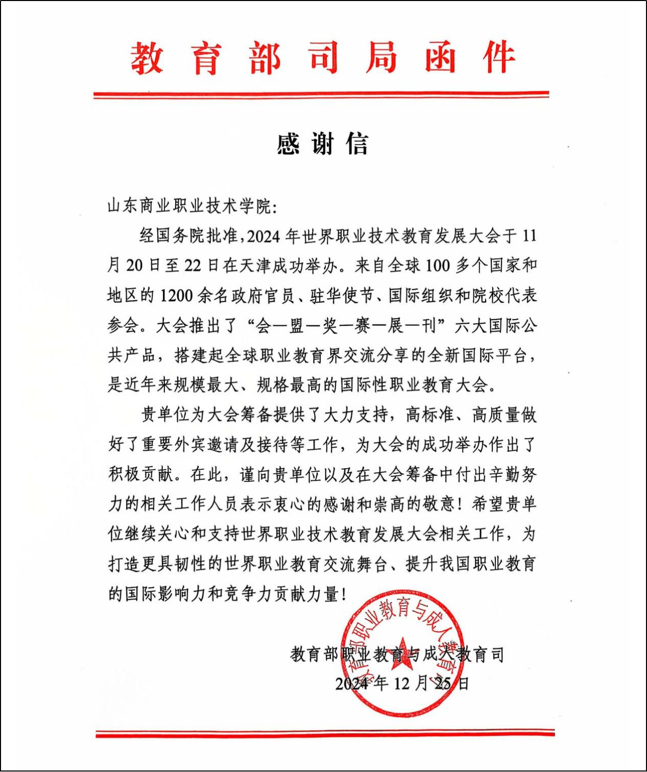 近日,教育部職業(yè)教育與成人教育司向山東商職學(xué)院發(fā)來感謝信,感謝學(xué)校為2024年世界職業(yè)技術(shù)教育發(fā)展大會的籌備及高標(biāo)準(zhǔn)、高質(zhì)量邀請和接待重要外賓等所做的工作。