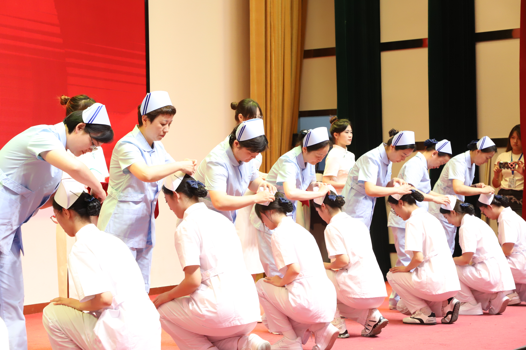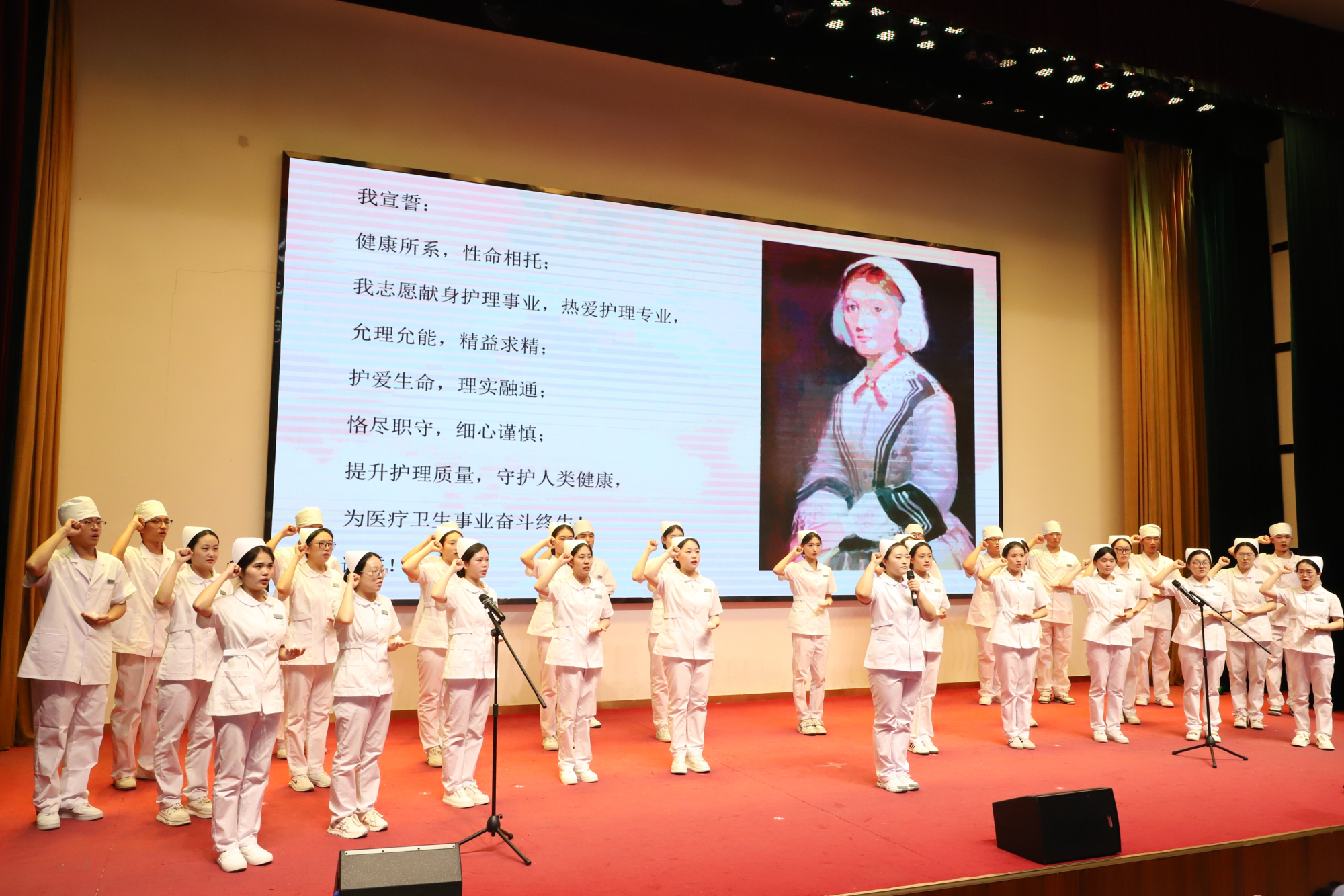 在悠揚的旋律中,護理行業前輩們親手為護生佩戴象征神圣使命與責任擔當的燕尾帽,將承載南丁格爾精神的生命燭火鄭重傳遞。全體護生面向燭火莊嚴宣誓,誓言字字千鈞、擲地有聲,彰顯出護理學子投身健康事業的堅定信念與崇高追求。