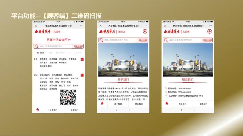 為優化守信經營氛圍及健全商戶信用管理體系,由營運團隊自主研發搭建“商戶信用查詢平臺”,該平臺通過顧客前端與管理后端兩個端口管理支撐實現四個功能,前端消費者可通過展廳二維碼掃描隨時查看品牌經營資質,打消顧慮實現信用公開可視化;后端設定提前30天預警功能實現授權資質和工廠資質預警管理自動化,多維度有效管理控制商戶風險,引導商戶由被動管理走向自助管理。