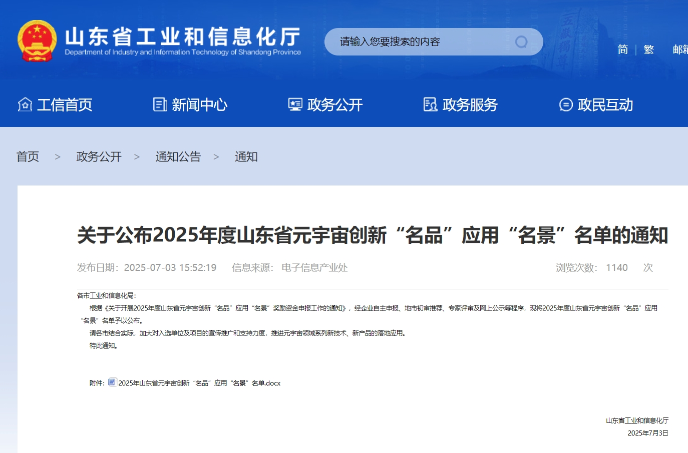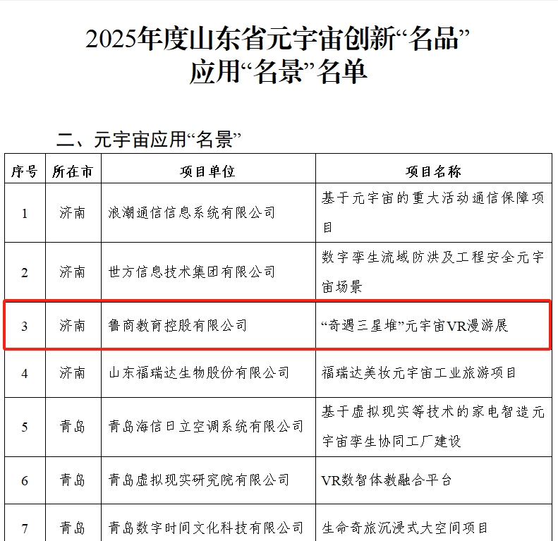 近日,山東省工業和信息化廳正式公布2025年度山東省元宇宙創新“名品”應用“名景”名單,魯商產投所屬魯商教育控股有限公司申報的“奇遇三星堆”元宇宙VR漫游展項目成功入選。