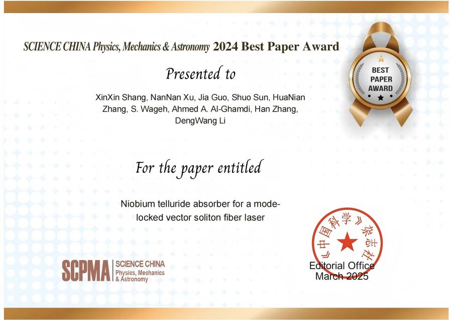 近日,從《中國科學(xué)》雜志社獲悉,齊魯醫(yī)藥學(xué)院醫(yī)學(xué)影像學(xué)院教師尚新新博士發(fā)表于國際著名學(xué)術(shù)期刊《SCIENCE CHINA Physics, Mechanics & Astronomy》的研究論文《Niobium telluride absorber for a mode-locked vector soliton fiber laser》(基于碲化鈮飽和吸收體的矢量孤子超快光纖激光器)榮獲該刊頒發(fā)的“2024年度優(yōu)秀論文獎”。