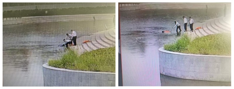 和超立即將現(xiàn)場情況上報物業(yè)監(jiān)控中心請求支援,并同步撥打報警電話,他自己則持續(xù)大聲與阿姨保持溝通、言語安撫,努力穩(wěn)定其情緒。張政則迅速跑向附近的應急物資存放點,取來救生圈與救生繩,奮力將救生圈拋投至阿姨附近水面,并高聲引導其抓住救生設備。很快,另一名聞訊趕來的隊員張萌也加入支援,三人默契配合、協(xié)力施救,最終成功將阿姨救助上岸。