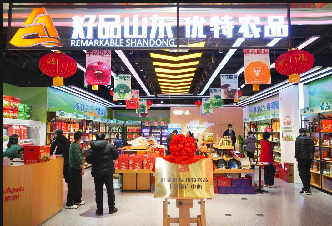 該中心坐落于北京和諧廣場負一層,自2025年11月試運營以來,已初步成為山東物產的展示櫥窗。中心匯聚了平陰玫瑰、萊陽梨膏、樂陵金絲小棗等十六市的代表性產品,涵蓋糧油、生鮮、飲品、深加工禮盒等全品類,通過場景化的長期陳列,讓首都消費者隨時都能“一站式”選購正宗山東好品。