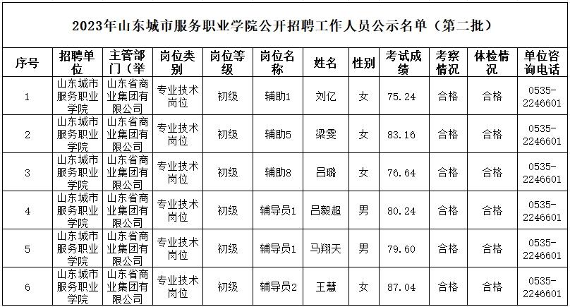 根據《中共山東省委組織部、山東省人力資源和社會保障廳關于印發2023年度省屬事業單位公開招聘工作實施方案的通知》(魯人社發〔2022〕23號)等相關規定,山東城市服務職業學院經過公開招聘報名、考試、考察、體檢等工作,現對擬聘用人員(第二批)進行公示,公示期為7個工作日,自2023年11月23日至2023年12月1日(不含節假日)。公示期間,如對公示人選有異議,請及時向山東省商業集團有限公司反映。